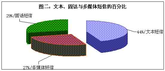 目前市場的主流短信主要有三大類,即傳統(tǒng)的手機文本短信、流行的圖音文字兼?zhèn)涞摹安市拧焙托峦瞥龅墓淘挾绦。整個短信市場確實火了,但是在火爆的背后哪一種短信是真正的巨無霸?調查表明,在三類短信之中,選擇文本類短信的用戶最多,占據44%,其次是固話短信,再次是多媒體短信,即俗稱的“彩信”,選擇固話短信和彩信的百分比十分接近。(見圖二)看來,“巨無霸”非文本類短信莫屬。
