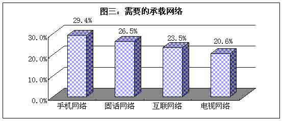 隨著各項增值業(yè)務的飛速發(fā)展,承載這些業(yè)務的網絡的格局也在靜悄悄地“變”。用戶選擇“最需要的承載”結果如圖三,雖然被調查者選擇“手機網絡”、“固話網絡”、“互聯(lián)網絡”和“電視網絡”的百分比十分接近,但是我們亦不難發(fā)現(xiàn)潛在的格局變化。
