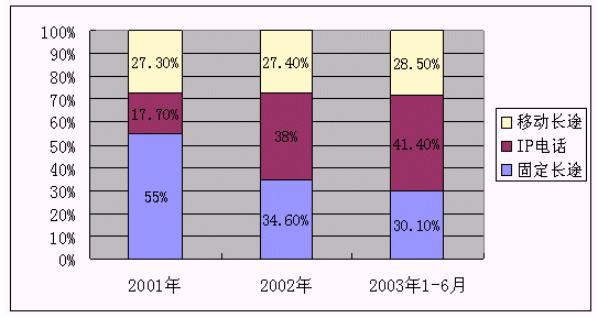 從圖上看,移動(dòng)長(zhǎng)途占整個(gè)長(zhǎng)途通話比重增長(zhǎng)緩慢,IP長(zhǎng)途所占比重上升較快,已由2001、2002年的17.7%、38%上升到41.4%,與此相反,傳統(tǒng)固定長(zhǎng)途所占比重下降較快,由2001年占整個(gè)長(zhǎng)途通話的55%,迅速下降到目前的30.1%。隨著移動(dòng)長(zhǎng)途、IP長(zhǎng)話的異質(zhì)競(jìng)爭(zhēng)加劇,大量分流了傳統(tǒng)固定長(zhǎng)途,2003年1-6月傳統(tǒng)固定長(zhǎng)途中國(guó)內(nèi)長(zhǎng)途、國(guó)際及港澳臺(tái)通話時(shí)長(zhǎng)比上年同期分別下降0.6%、6.4%、13.9%。
