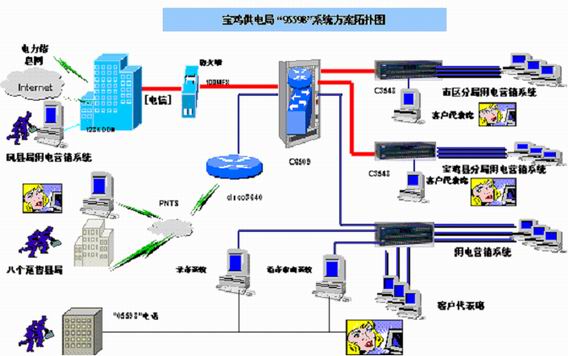 ⑵ 利用現(xiàn)有的計算機網(wǎng)絡基礎實現(xiàn)市區(qū)供電分局、寶雞縣供電分局、鳳縣供電分局三個供電分局與局客戶服務中心的信息聯(lián)結;