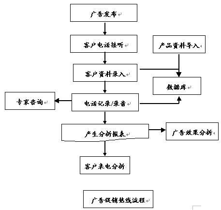 廣告熱線是在呼叫中心系統(tǒng)中設(shè)立專欄,為廣告中的產(chǎn)品或服務(wù)提供更詳細(xì)的資料。首先應(yīng)將需要在廣告中出現(xiàn)的詳細(xì)內(nèi)容或不適合在廣告中出現(xiàn)的內(nèi)容按照要求導(dǎo)入呼叫中心系統(tǒng),準(zhǔn)備就緒后,就在媒體或其他介質(zhì)上做廣告,其中廣告的內(nèi)容中含廣告熱線號(hào)碼。電話號(hào)碼建議采用800電話,以提高客戶撥打電話的積極性。呼叫中心會(huì)記錄打進(jìn)的每一個(gè)電話,并且提供完成的系統(tǒng)報(bào)表。這樣可以彌補(bǔ)廣告中提供給消費(fèi)者內(nèi)容不足的缺陷,另一方面可以根據(jù)電話量判斷廣告的效果。