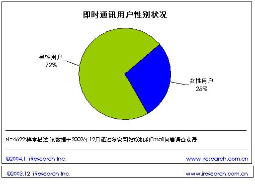 根據(jù)艾瑞市場(chǎng)咨詢(iResearch)的《2003年中國(guó)即時(shí)通訊研究報(bào)告》研究結(jié)果表明,在中國(guó)的即時(shí)通訊用戶中,72%的即時(shí)通訊用戶為男性,占據(jù)了大部分份額。女性用戶僅僅占28%?磥(lái)男性網(wǎng)民更喜歡在網(wǎng)上聊天。