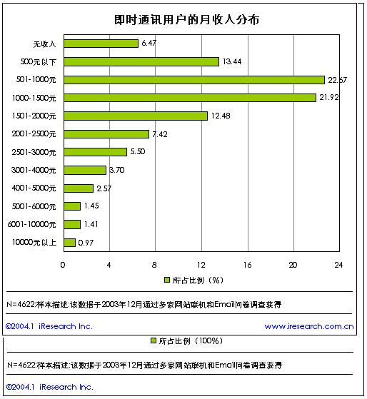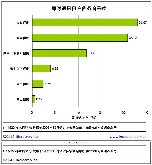 從即時(shí)通訊用戶的學(xué)歷水平來(lái)分析,在目前的即時(shí)通訊用戶中,大專以上教育程度的用戶比例達(dá)到了75%,占據(jù)了絕對(duì)高的比例。顯示出即時(shí)通訊用戶的整體教育水平非常高。