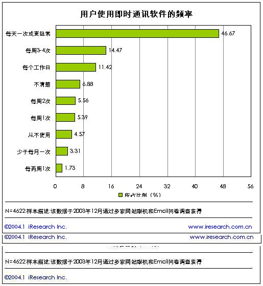 即時(shí)通訊所擁有的實(shí)時(shí)性、跨平臺(tái)性、成本低、效率高等諸多優(yōu)勢(shì),使之成為網(wǎng)民們最喜愛(ài)的網(wǎng)絡(luò)溝通方式之一。從用戶使用即時(shí)通訊軟件的頻率來(lái)看,是比較高的。根據(jù)我們的調(diào)研結(jié)果,58%的用戶至少每天使用一次即時(shí)通訊軟件,使用頻率在每周一次以下的用戶比例僅為15%。