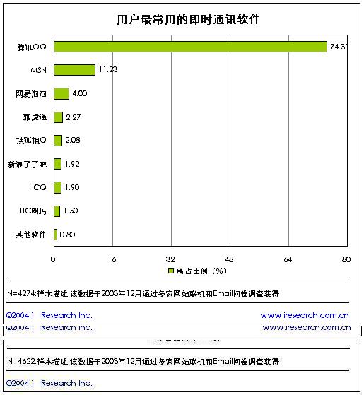 新迎來(lái)的2004年對(duì)于中國(guó)的互聯(lián)網(wǎng)是充滿無(wú)限憧憬的一年,互聯(lián)網(wǎng)用戶打到了近8000萬(wàn),在繼短信、網(wǎng)絡(luò)廣告、網(wǎng)絡(luò)游戲成為中國(guó)網(wǎng)絡(luò)企業(yè)發(fā)家致富的法寶之后,即時(shí)通訊又將是一塊無(wú)限誘惑的領(lǐng)地,成為門戶網(wǎng)站、電信運(yùn)營(yíng)商展開(kāi)廝殺的新大陸。