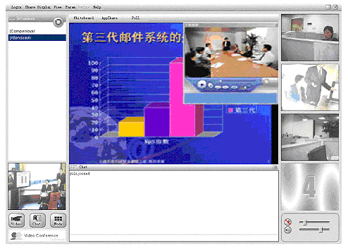 計(jì)算機(jī)、網(wǎng)絡(luò)技術(shù)高速發(fā)展的今天,傳統(tǒng)的通訊方式日益滿(mǎn)足不了人們的要求。人們要求能進(jìn)行遠(yuǎn)程會(huì)議,開(kāi)展面對(duì)面的交流;同時(shí),在滿(mǎn)足傳統(tǒng)視頻會(huì)議音/視頻通信的基本要求之外,現(xiàn)代會(huì)議更希望能夠提供更加豐富多樣的會(huì)議討論形式和功能,比如:遠(yuǎn)程開(kāi)展季度/年度預(yù)算及工作計(jì)劃的討論,需要遠(yuǎn)程共享PPT等演示文檔和EXCEL等表格,需要共同就某一網(wǎng)上信息開(kāi)展討論,甚至能夠?qū)㈤_(kāi)會(huì)的通知通過(guò)電子郵件和手機(jī)短消息的方式傳達(dá)到每一個(gè)與會(huì)者那里。