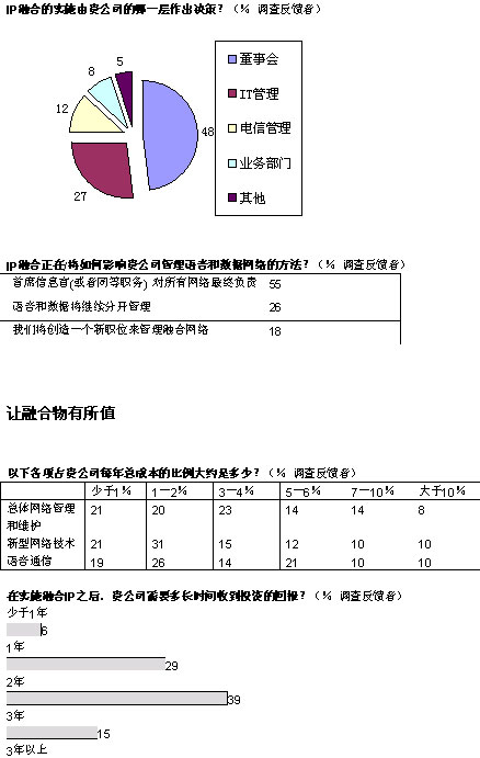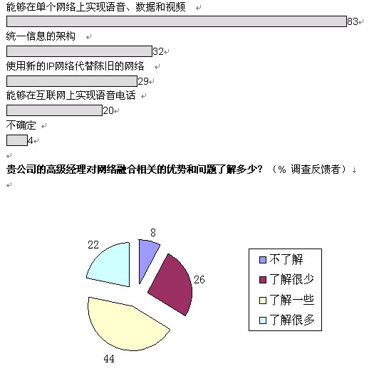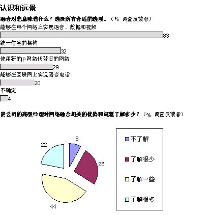 從更為廣泛的層面上看,我們的調(diào)查結(jié)果顯示:三分之一的管理人員對融合網(wǎng)絡(luò)的益處一無所知或者知之甚少。困惑的并不僅是高級經(jīng)理們:分析公司IDC近期對歐洲600余名廣域網(wǎng)管理人員進(jìn)行的調(diào)查顯示,只有五分之一的人能夠完全了解融合網(wǎng)絡(luò)所實現(xiàn)的各項功能。