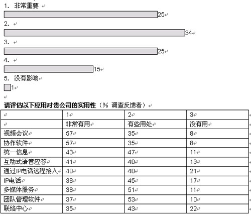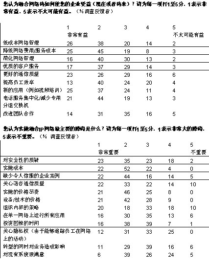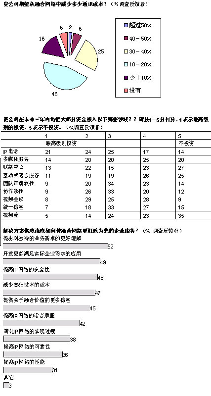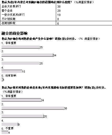 我們調(diào)查的企業(yè)中,有超過三分之二將在未來五年內(nèi)實現(xiàn)大多數(shù)或者所有部門向融合網(wǎng)絡(luò)的轉(zhuǎn)型。大部分企業(yè)采取按部就班的形式在某些特殊部門和業(yè)務(wù)開始部署。在融合應(yīng)用中,IP語音電話將在未來三年內(nèi)吸引大量投資;管理人士期望通過大幅削減公司內(nèi)部的通話費(fèi)用獲得早期的回報。在更廣泛的層面上,大多數(shù)管理者預(yù)計,融合網(wǎng)絡(luò)對其企業(yè)的商業(yè)影響將會“非常重要”或者“重要”。