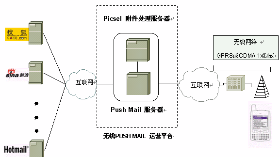 對于擁有便攜式計算機的用戶,在移動中,通過對其計算機進行相應的軟、硬件的配置,根據(jù)其所在地的可利用的資源,可以開啟便攜式計算機借助于GPRS、CDMA1x、WiFi無線或有線寬帶和撥號等手段上網(wǎng)訪問其EMAIL。而在沒有便攜式計算機或計算機關閉的情況下,PUSH MAIL系統(tǒng)可以在GPRS和CDMA1x廣泛的覆蓋范圍內(nèi)主動地將您的EMAIL"推"送到您的手機上,手機在接收到EMAIL后會發(fā)出提示音,使用戶可以在第一時間及時地閱讀到您的EMAIL及其附件。