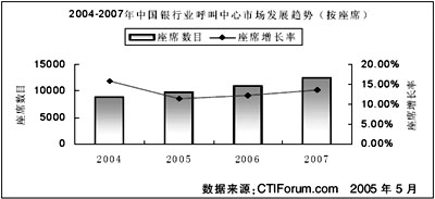 從1999年我國第一批銀行客戶服務中心建立至今,銀行客服中心已經從飛躍發(fā)展期進入到平穩(wěn)發(fā)展階段。根據CTI論壇《2005年中國呼叫中心產業(yè)發(fā)展研究報告》,截至2004年底,我國總共擁有客戶服務中心座席數18.4萬個,市場總規(guī)模達到227.1億元人民幣。其中銀行業(yè)客戶服務中心座席總數量為8800個左右,市場規(guī)模約46.2億元,分別占整個呼叫中心市場的4.78%和20.34%。