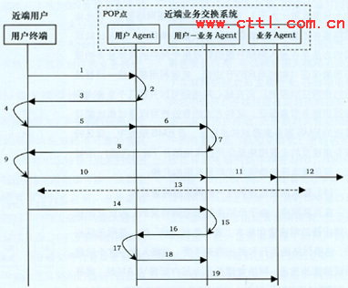 在POP點處,每類業(yè)務(wù)有一個“業(yè)務(wù)Agent”,其生命周期與運營商此類業(yè)務(wù)的生命周期相同,即從運營商開通此類業(yè)務(wù)到運營商終止提供此類業(yè)務(wù)為止,因此“業(yè)務(wù)Agent”基本上是長期存在的!皹I(yè)務(wù)Agent”負(fù)責(zé)對不同用戶的同類業(yè)務(wù)進行匯聚,統(tǒng)一與遠端的“業(yè)務(wù)Agent”進行業(yè)務(wù)交互。