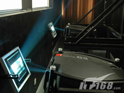 為了達(dá)到足夠大的尺寸,主屏幕采用SEAPRINE圖像控制器組成的1*2拼接,也就是采用了兩臺(tái)BARCO G5投影機(jī)來確保畫面的一流效果。不過由于投影距離的限制,這個(gè)方案里采用了二次反射系統(tǒng)。這也是這套方案的一個(gè)要點(diǎn)和關(guān)鍵。因?yàn)楹芏喙こ處熇靡恍└怕蕘砉浪阋淮位蚨啻握凵淇梢钥s短的投影距離,但欠缺科學(xué)和嚴(yán)謹(jǐn)?shù)膽B(tài)度,因?yàn)檫@個(gè)數(shù)據(jù)與屏幕安裝高度、投影方式(離軸或偏軸)、投影機(jī)體積、反射鏡面積等息息相關(guān)。