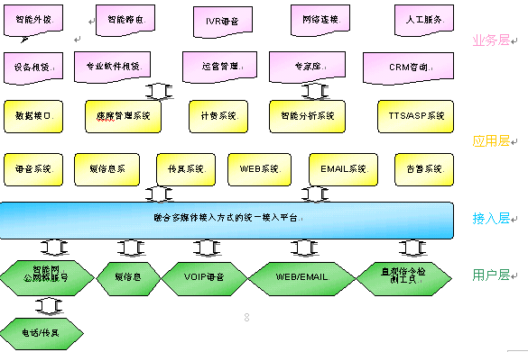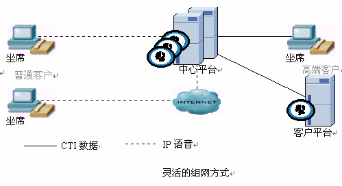 中心系統(tǒng)具備網(wǎng)絡(luò)呼叫中心及靈活的設(shè)備組網(wǎng)方式,必須使用多種媒體結(jié)合技術(shù),平臺(tái)能智能處理來(lái)自不同媒體的服務(wù)請(qǐng)求。多媒體包含了固定電話、移動(dòng)電話、傳真、尋呼、短消息、Web、Email、視頻、PDA等多媒體。
