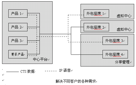 外包中心應(yīng)既能服務(wù)本地業(yè)務(wù),同時(shí)服務(wù)本區(qū)甚至全球業(yè)務(wù),單點(diǎn)互連接主要為降低服務(wù)成本,共享服務(wù)資源。單點(diǎn)中心應(yīng)具備靈活的組網(wǎng)方式,可管理客戶現(xiàn)有平臺(tái),并具備高質(zhì)量座席向客戶提供高質(zhì)量的高端服務(wù),同時(shí)又有解決普通客戶服務(wù)的一般座席,向客戶提供低價(jià)位的公眾服務(wù),如下圖示意: