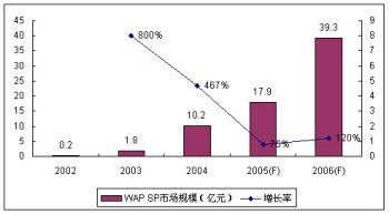 2005年中國運營商對WAP沉默用戶的清理和一系列內容監(jiān)管措施使得WAP市場前兩年的高速增長勢頭減緩,SP市場規(guī)模增長率下探至75%,規(guī)模達17.9億元。諾盛預計由于運營商監(jiān)管政策的連續(xù)性及其對免費WAP網站的政策調整,2006年的WAP市場仍然無法恢復2004年以前的高速增長勢頭,但增長率略有回暖,達到120%。