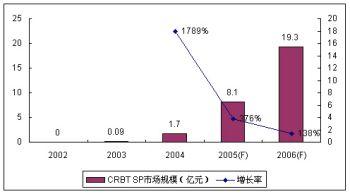 在運營商的大力推動和SP/CP的積極努力下,無線音樂市場從2004年起進入了井噴時期。CRBT業(yè)務具有的病毒式營銷特性使得CRBT業(yè)務的滲透率增長迅速,但其時尚特性又使得業(yè)務的滲透率高峰很容易達到、業(yè)務縱深有限。2005年,CRBT的SP市場規(guī)模增長率為376%,較上一年的高速增長有所回落。諾盛預計2006年運營商和SP/CP仍然會力推CRBT業(yè)務。在產業(yè)鏈積極推動和用戶滲透率高峰已經逼近的雙重制約下,諾盛預計CRBT業(yè)務的SP市場規(guī)模增長率為138%,整體SP市場規(guī)模達到19.3億元。