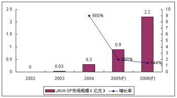 作為SP和移動運營商都非常看好的業(yè)務,JAVA業(yè)務受到眾多SP的青睞。盡管作為JAVA主要業(yè)務的手機游戲目前盈利狀況普遍欠佳,但空中網、美通無線、數字魚等SP仍然大量投入,期待著未來業(yè)務的高速增長。受制于終端和JAVA游戲的表現力,2005年JAVA業(yè)務的SP市場規(guī)模增長率回落到200%,諾盛預計2006年JAVA的使用環(huán)境沒有太大變化,其增長率進一步回落至144%。