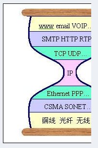 RFC1958和RFC3724等所描述的“端到端的透明性”是Internet一直堅持的為數(shù)不多的Internet體系架構的核心設計理念。所謂端到端的透明性,就是在TCP/IP的設計中,將Internet系統(tǒng)中與通信相關的部分(IP網(wǎng)絡)與高層應用(端點)分離,最大限度地簡化網(wǎng)絡的設計。在有些文獻中也稱其為“沙漏”模型,如圖1。
