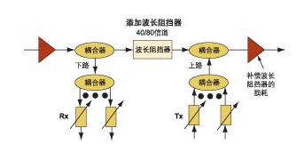 圖2當(dāng)帶寬增加需要波長(zhǎng)重用時(shí),可添加波長(zhǎng)阻擋器到需要的節(jié)點(diǎn)上。