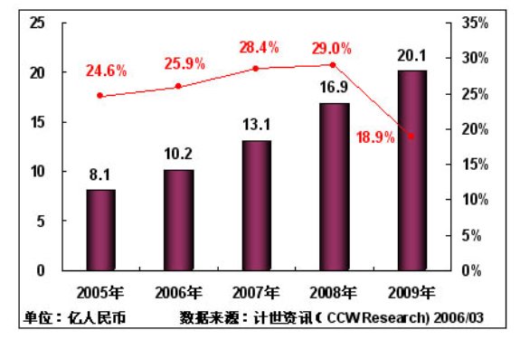 計世資訊(CCW Research)預(yù)計:2006年中國城市應(yīng)急聯(lián)動系統(tǒng)IT投資將保持25.9%的增長率,投資規(guī)模將達到10.2億元;由于"十一五"規(guī)劃的實施,以及數(shù)字奧運進入關(guān)鍵建設(shè)階段,預(yù)計在2007年,中國城市應(yīng)急聯(lián)動系統(tǒng)增長率達到28.4%,2008年增長率達到29.0%;到2009年中國城市應(yīng)急聯(lián)動系統(tǒng)將進入穩(wěn)定增長階段,IT投入將達到20.1億元。