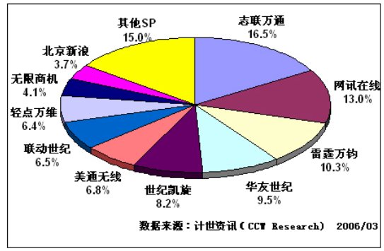 計世資訊(CCW Research)數(shù)據(jù)顯示:從各SP的收入構(gòu)成來看,IVR業(yè)務(wù)的市場集中度非常高。以中國聯(lián)通為例,收入前10位的SP有:志聯(lián)萬通、網(wǎng)訊在線、雷霆萬鈞、華友世紀(jì)、世紀(jì)凱旋、美通無線、聯(lián)動世紀(jì)、輕點萬維、無限商機(jī)、北京新浪,他們的總收入占到聯(lián)通全部IVR業(yè)務(wù)收入的85%。