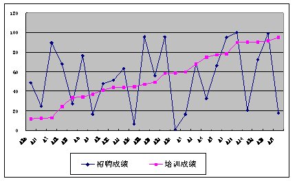 相反,如果培訓成績和工作績效的關系如圖5,從中我們可以看出,培訓的成績和招聘的成績表現(xiàn)出很強的正相關,說明培訓成績好的人,其工作績效相應好,培訓成績差的人,其工作績效也差,說明培訓是有效的。