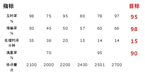 從滿意度的角度來看:5月份的指標值已達到目標值95%的要求,但只統(tǒng)計了2月份和5月份兩個月的數(shù)據(jù),數(shù)據(jù)收集不完整,因此,我們對該指標無法評價(一般認為對三個以下的數(shù)據(jù)無法做出評價)。