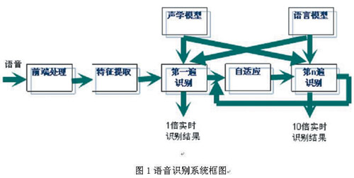 圖1所示為當(dāng)前大多數(shù)語音識別系統(tǒng)采用的框架和流程。原始語音經(jīng)前端處理后,從中提取出若干維的特征向量用于識別。識別時,聲學(xué)模型和語言模型共同作用,得到使某一概率最大的字串作為識別結(jié)果。