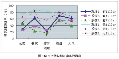 對于電話連續(xù)語音識別來說,由于錄制環(huán)境是辦公室真實環(huán)境,因此噪音并不是影響性能的主要因素。電話連續(xù)語音識別分為5個子領(lǐng)域,每個子領(lǐng)域各有一套語法。評測句子由語法生成的有效成分在前后加上任意長的填充詞(filler)構(gòu)成,如語法生成的句子為“從天安門到中關(guān)村怎么坐公交車”,而實際錄制的句子是“你好,請問從天安門到中關(guān)村怎么坐公交車,可以查到嗎?”,其中的“你好,請問”和“可以查到嗎”就是filler。由分析可以發(fā)現(xiàn),不同領(lǐng)域內(nèi)的槽識別正確率相差很大。這主要有兩個原因,一是不同領(lǐng)域的語法復(fù)雜度不同,二是不同領(lǐng)域內(nèi)有filler的句子所占比例不同。為了進(jìn)一步衡量filler對識別的影響,選取三個識別系統(tǒng),將有filler的句子和沒有filler的句子分別計算識別率,統(tǒng)計結(jié)果如圖2所示。從圖中可以看出,filler對識別的影響是相當(dāng)大的,無filler的句子比有filler的句子識別正確率可以高幾十個百分點。