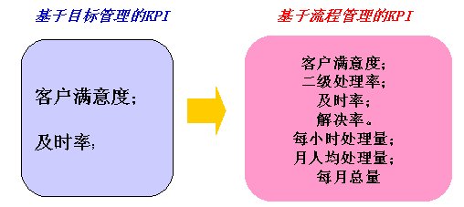 從上圖可看出:原來基于目標的KPI更多關注結(jié)果,而基于流程的KPI不僅關注結(jié)果,而且更關注流程效率,基于流程的KPI使所有人員在日常工作中更加關注和重視流程。