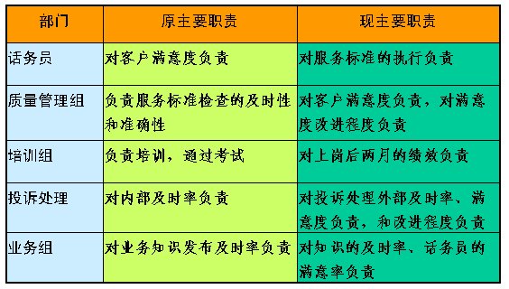 首先,要根據(jù)組織的目標來確定我們需要哪些流程,即需要哪些流程才能保證組織目標的實現(xiàn);其次,根據(jù)流程的需要,即為了保證流程的有效運行,來劃分不同部分的職責;最后,根據(jù)各部分職責的劃分來設置組織的架構(gòu)。如我們根據(jù)客服中心流程運行的需要,對組織架構(gòu)和相關班組的主要職責進行了調(diào)整,以保證流程的有效順暢運行。如部分班組的主要職責調(diào)整如下: