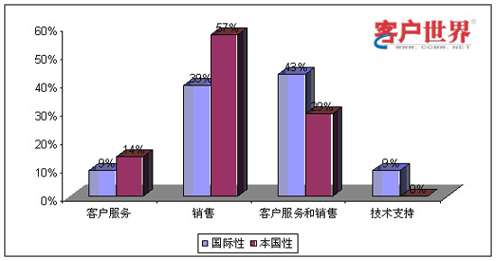 從業(yè)務功能看來,國際性呼叫中心和本國性呼叫中心承擔著不同的角色。9%的國際性呼叫中心和14%的本國性呼叫中心提供僅限于客戶服務,例如賬號查詢和催費收款。39%的國際性呼叫中心和59%的本國性呼叫中心專門展開網(wǎng)上營銷和銷售(外撥為主)。43%的國際性呼叫中心和29%的本國性呼叫中心同時承擔客戶服務和銷售功能。最后,我們調(diào)查到9%的國際性呼叫中心專門從事技術支持,而且這些中心專門為國際市場設立。服務功能上的差異會對商業(yè)定位和人力資源管理提出不同的要求。