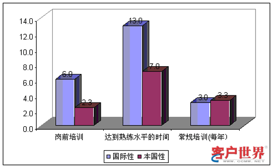 總體看來,印度呼叫中心提供平均為4.1周的崗前培訓。其中,國際性呼叫中心平均提供6周崗前培訓,明顯高于本地性呼叫中心的2.3周。這是因為國際呼叫中心把崗前培訓的相當一部分時間投入到英語能力的培訓和提高上面。此外,參加調(diào)研的呼叫中心主管認為,新員工平均在開始工作10周以后才能達到熟練水平。同樣地,我們發(fā)現(xiàn)國際性呼叫中心和本地性呼叫中心在這一指標上存在顯著差異。在國際性呼叫中心需要達到熟練水平的時間