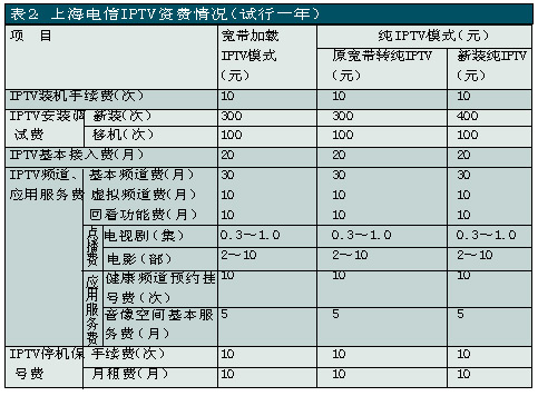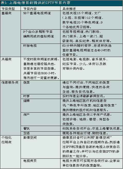 上海電信是國內(nèi)關(guān)注并切入IPTV業(yè)務(wù)較早的電信運(yùn)營商之一,自2005年就開始積極測試和試驗(yàn)。此次上海電信在全上海市范圍內(nèi)推出IPTV業(yè)務(wù),被業(yè)界看作是“中國IPTV規(guī)模商用的新紀(jì)元”。除了影視節(jié)目收看、視頻內(nèi)容點(diǎn)播、時移功能外,上海電信的IPTV服務(wù)還包括時事新聞、遠(yuǎn)程醫(yī)療、視頻房產(chǎn)信息、餐飲信息、天氣預(yù)報(bào)、票務(wù)查詢等信息服務(wù)以及可視電話、IPTV游戲等個性化應(yīng)用。其中IPTV的直播頻道有58個,視頻點(diǎn)播可選節(jié)目量達(dá)3000小時以上。另外,上海電信還推出了影像空間和電視大黃頁等應(yīng)用服務(wù),攝像愛好者可以利用“影像空間”應(yīng)用平臺上傳自己的視頻作品,然后通過IPTV機(jī)頂盒在自家的電視上欣賞自己的得意之作,并可以與已安裝IPTV的親朋好友一起分享;電視大黃頁可實(shí)現(xiàn)對各類行業(yè)、企事業(yè)單位信息資訊的搜索查詢。