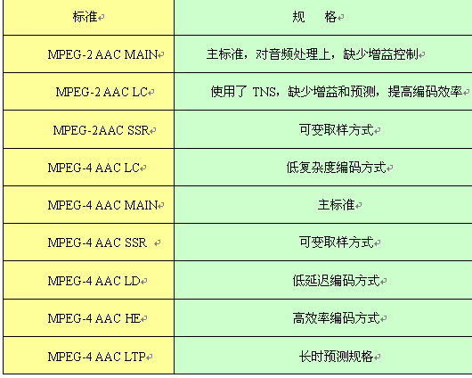 目前國際上對(duì)音頻處理技術(shù)上標(biāo)準(zhǔn)較多,在對(duì)下一代實(shí)時(shí)交互音頻處理上可以采用MPEG-1Layer2或AAC系列音頻,對(duì)選用標(biāo)準(zhǔn)的原則是,音頻頻響范圍要達(dá)到22KHz,這樣就幾乎可以覆蓋了人耳聽覺的全部范圍,甚至在高頻方面還有所超越,能夠使現(xiàn)場音頻得到真實(shí)自然的還原,并且在還原時(shí)可以采用雙聲道立體聲回放,使整個(gè)視頻通訊的聲音有更強(qiáng)的臨近感,達(dá)到CD級(jí)音質(zhì)。同時(shí)在對(duì)鏈路帶寬的適應(yīng)和編解碼效率上達(dá)到最佳。下表列出AAC的9種規(guī)格。