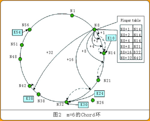 這種查詢機制只要求節(jié)點知道順時針方向上自己后面那個節(jié)點的位置(自己的successor),查詢效率低,花費的平均時間是函數(shù)O(N/2)的值,N是Chord環(huán)的實際節(jié)點數(shù)。為提高查詢效率,Chord中每個節(jié)點除了記錄successor和predecessor(順時針方向上自己前面的那個節(jié)點)外,還要記錄m個其他節(jié)點。這m個節(jié)點由successor(n+2i-1)確定,其中n是本節(jié)點的哈希值,i是1到m間的整數(shù)。m個節(jié)點的集合就是finger表(圖2中給出N8的finger表)。這種方式下查詢資源花費的平均時間為O(logN)。
