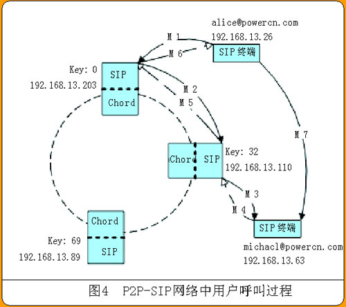 IP地址為192.168.13.26的用戶alice@powercn.com要呼叫用戶michael@powercn.com。alice可以把請求發(fā)給P2P-SIP網(wǎng)絡中任一PN?紤]到要在P2P-SIP網(wǎng)絡上提供增值業(yè)務(比如計費),alice把INVITE請求發(fā)給管理它的PN更合適一點,在本例中是IP為192.168.13.203,Key值為0的PN。如圖4中M1所示。