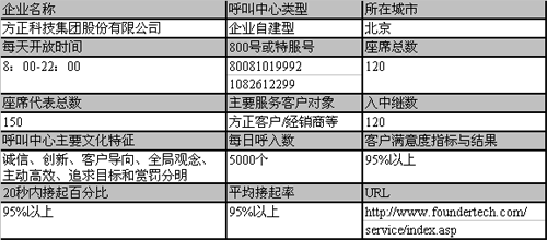 方正呼叫中心是方正服務平臺的重要組成部分,1999年建立,秉承了北大方正“勤備、嚴謹、求實、創(chuàng)新”的精神,依托方正科技“誠信、創(chuàng)新、客戶導向、全局觀念、主動高效、追求目標和賞罰分明”的核心價值觀,以及“全程服務”的品牌文化,以“優(yōu)化服務流程,提高服務質(zhì)量,培育優(yōu)秀品牌,形成競爭優(yōu)勢,創(chuàng)新服務模式,加速業(yè)務增長”作為自己的發(fā)展目標和方向,并學習業(yè)界先進的理念和方法,不斷探索和發(fā)展,多次受到媒體和機構的關注。