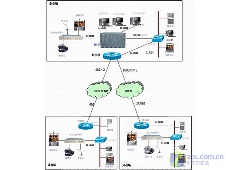 上面是一個基于H.323協(xié)議的典型視頻會議系統(tǒng)組網(wǎng)方案。由于基于H.323的視頻會議系統(tǒng)在物理線路上是允許與數(shù)據(jù)網(wǎng)絡共用的,所以上面的組網(wǎng)方案中還包括了數(shù)據(jù)網(wǎng)絡的部分。