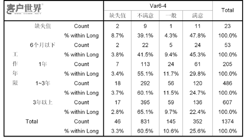 我們使用SPSS進(jìn)行交叉分析后,得到了不同層次的座席代表滿(mǎn)意度數(shù)據(jù),例如: