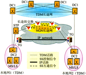 NGN網絡作為現有TDM長途網的補充,實現話務的分擔和保護。NGN大容量、廣覆蓋的優(yōu)勢,可以快速分流長途話務。NGN網與TDM網的關系如圖2所示。