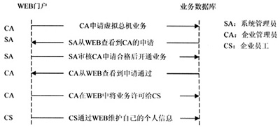 虛擬總機(jī)系統(tǒng)開戶流程采用WEB方式實(shí)現(xiàn),以此完成用戶對(duì)虛擬總機(jī)業(yè)務(wù)的定購、系統(tǒng)管理員對(duì)用戶開戶申請(qǐng)的審核、用戶業(yè)務(wù)參數(shù)的控制等操作,最后企業(yè)員工可以在企業(yè)管理員許可業(yè)務(wù)后,登陸WEB門戶管理個(gè)人信息。具體流程如圖2所示。
