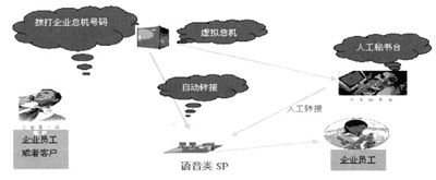 步驟五:如果用戶不知道員工分機(jī)號(hào)碼或者希望了解其他信息,主叫用戶可以選擇接入人工秘書臺(tái)。此時(shí)人工秘書臺(tái)會(huì)依據(jù)被叫號(hào)碼檢索出被呼叫集團(tuán)的信息,同時(shí)根據(jù)主叫號(hào)碼檢索出主叫用戶是否為企業(yè)內(nèi)部員工或者企業(yè)客戶,同時(shí)將這些信息同步更新到人工秘書臺(tái)上,話務(wù)員根據(jù)這些信息可以完成作為企業(yè)特色話務(wù)員的服務(wù)工作;