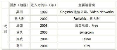 歐洲部分國(guó)家和地區(qū)進(jìn)入IPTV市場(chǎng)的年份及主要運(yùn)營(yíng)商