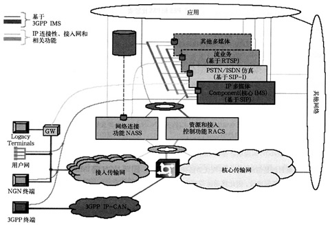 業(yè)務(wù)層包括下面的元素:PSTN/ISDN模擬子系統(tǒng)(PSS)即IMS核心子系統(tǒng)、PSTN/ISDN仿真子系統(tǒng)(PES)、其他多媒體子系統(tǒng)(如流媒體子系統(tǒng)、內(nèi)容多播子系統(tǒng)等)和應(yīng)用以及可以用于多個子系統(tǒng)的公共元素(如接入應(yīng)用、計(jì)費(fèi)功能、用戶屬性管理、安全管理和路由管理等);傳送層為用戶終端提供了基本的IP連接的能力,其中的網(wǎng)絡(luò)附屬子系統(tǒng)(NASS)和資源認(rèn)證控制子系統(tǒng)(RACS)屏蔽了IP層以下的接入網(wǎng)/核心網(wǎng)所使用的傳送技術(shù),給固網(wǎng)NGN用戶終端提供了IP的連續(xù)性。
