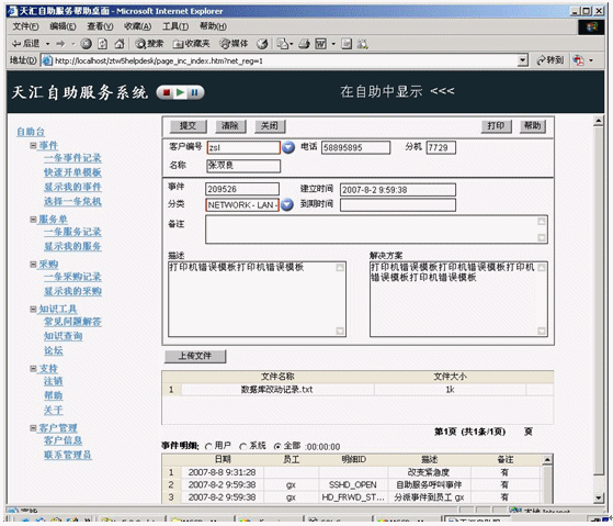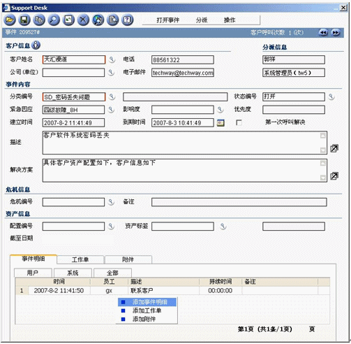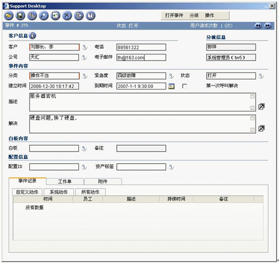 事件記錄應該在某個服務臺工具中記錄和跟蹤,該工具最好是作為集成的服務管理工具集的構成部分。該工具應該在引發(fā)新的事件時提供最基本的事件記錄。比如為了幫助提高效率,當你在天匯幫助臺的用于記錄事件的事件窗口中輸入請求發(fā)起者的姓名時,利用客戶數據庫可以自動填充諸如位置、部門和聯系詳細信息等字段。天匯幫助臺還支持使用計算機電話集成