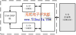 (1)存儲結(jié)構(gòu):DM642的存儲器系統(tǒng)由片內(nèi)內(nèi)存L1、L2和片外外存兩部分組成,L1,L2和片外SDRAM構(gòu)成了整個(gè)存儲器系統(tǒng)的三級層次結(jié)構(gòu),如圖2所示。其中,片內(nèi)內(nèi)存采用兩級緩存結(jié)構(gòu),第一級由L1P和L1D組成,L1距離DSP核最近,數(shù)據(jù)訪問速度最快,只需一個(gè)時(shí)鐘周期,只能作為不能尋址的Cache使用。第二級L2是一個(gè)統(tǒng)一的程序/數(shù)據(jù)空間,可以整體作為SRAM映射到存儲空間,也可以整體作為第二級Cache,或是二者按比例進(jìn)行組合。第三級是片外外存,一般由SDRAM構(gòu)成。L1Pcache大小為16KB,直接映射,每行大小32