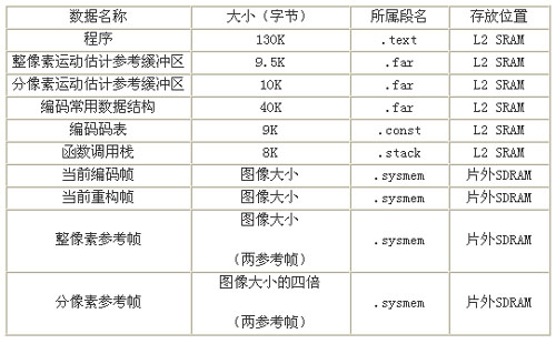 經(jīng)過優(yōu)化的程序和常用的數(shù)據(jù)結(jié)構(gòu)的大小可以放在L2中。所以按照上面的分析將L2配置為256KBSRAM,將程序代碼段(.text)、變量初值表(.cint)、常量字符串(.const)、全局變量靜態(tài)變量(.bss/.far)、堆棧段(.stack)等放入L2SRAM當(dāng)中,全局堆(.sysmem用于動(dòng)態(tài)存儲器分配)置于外部存儲器。表1總結(jié)了編碼器所要用到的存儲空間分配情況。