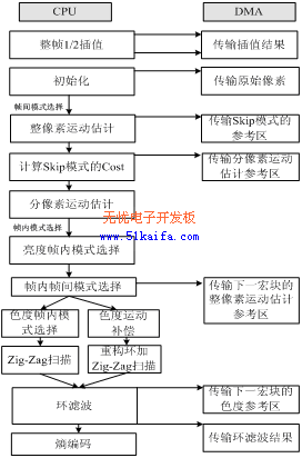 由于片內(nèi)存儲器容量的限制,不可能將編碼器的所有數(shù)據(jù)都放入片內(nèi)存儲器。原始圖像和重構(gòu)圖像是無法完全放到片內(nèi)存儲器中的。事實(shí)上,沒有必要將這些數(shù)據(jù)放在片內(nèi),因?yàn)榫幋a器的處理過程是以宏塊為單位的,我們只需要在片內(nèi)維護(hù)一個(gè)宏塊的數(shù)據(jù)結(jié)構(gòu),CPU訪問這些數(shù)據(jù)進(jìn)行計(jì)算。每編碼一個(gè)宏塊的時(shí)候把該宏塊需要的數(shù)據(jù)從外存調(diào)入內(nèi)存,填到相應(yīng)的這些數(shù)據(jù)結(jié)構(gòu)中。利用DM642提供的QDMA機(jī)制,CPU發(fā)出QDMA請求后就可以繼續(xù)對其它數(shù)據(jù)進(jìn)行計(jì)算,由DMA負(fù)責(zé)將數(shù)據(jù)從外存調(diào)到內(nèi)部存儲器。因此如何設(shè)計(jì)使CPU與DMA之間協(xié)調(diào)工作很重要,本文2.3部分將詳細(xì)討論這個(gè)問題。