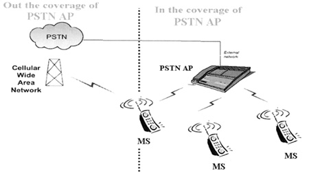 如圖3所示,使用藍牙CTP MS(mobile station)和PSTN AP,通過本地交換機與固網(wǎng)相連。其中,MS為雙模終端,可以根據(jù)不同網(wǎng)絡(luò)的資費差異預(yù)先設(shè)置采用何種網(wǎng)絡(luò)接打電話。在藍牙覆蓋范圍內(nèi),根據(jù)設(shè)置,CTP